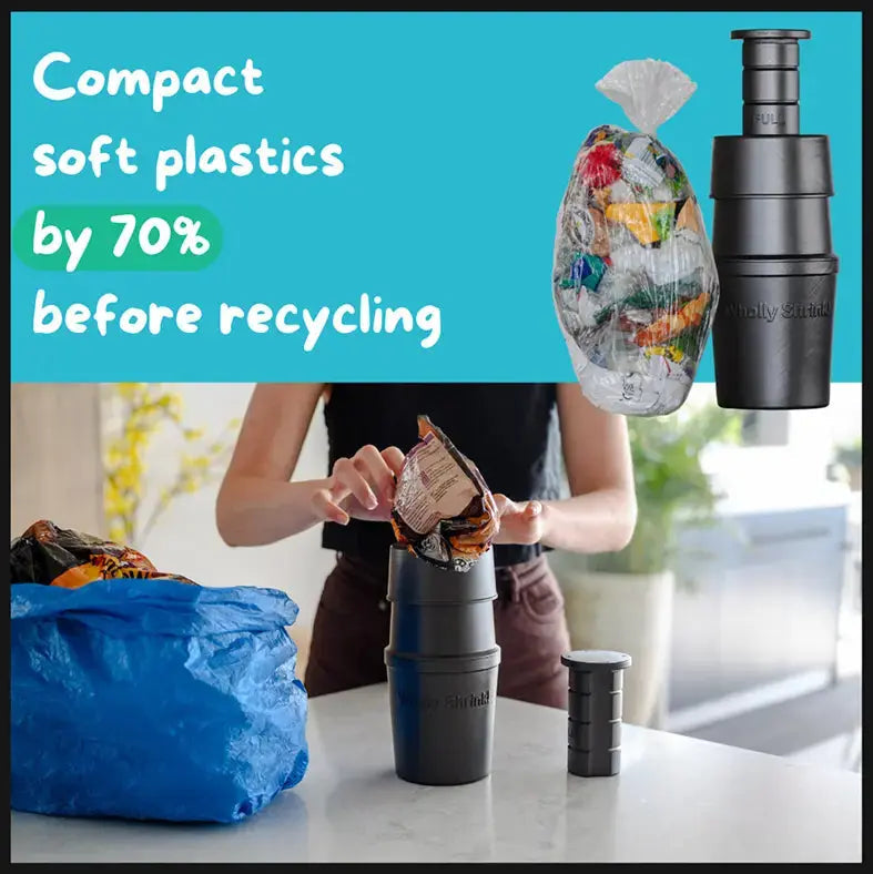 This revolutionary device makes it easy to collect, compress and store all types of soft plastics prior to recycling.